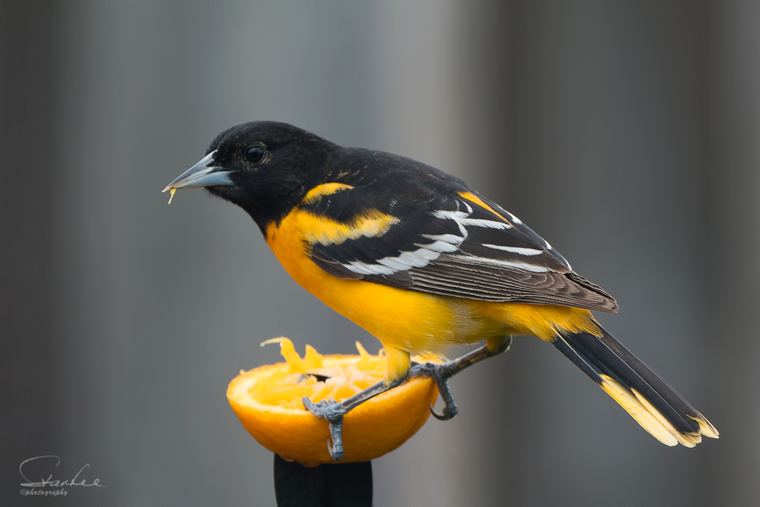 We have a pair of Baltimore Orioles frequent our hummingbird feeder first time ever. So I put out the orange for them and they must like it. They have been visiting everyday for the last few days. I have to shoot their photos thru the bedroom windows cos they fly away as soon as they see us. So no choice on the background.